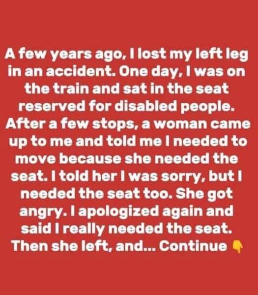 The girl shared her experience: “I lost my left leg in an accident and use a prosthetic. While I can walk and run, balancing on a moving train is hard. I was sitting in a reserved seat when the woman told me to move. I explained I needed the seat, but she got upset, called the conductor, and insisted I leave. Tired of arguing, I rolled up my pant leg, showed my prosthetic, and refused to move. She turned red and got off at the next station.”
