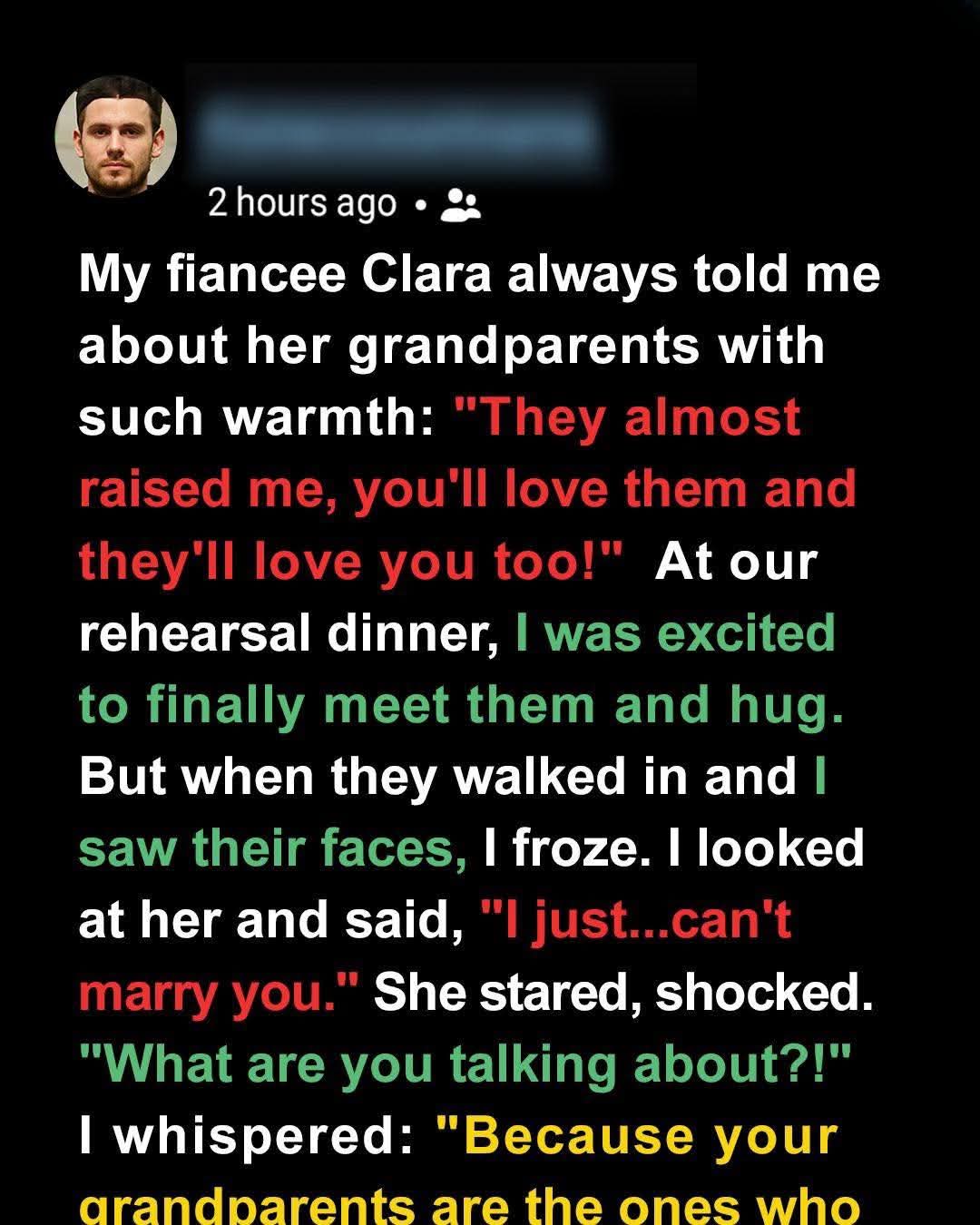 At our rehearsal dinner, Clara stepped away to take a call, and her grandparents walked in. The moment I saw their faces, my world stopped.
